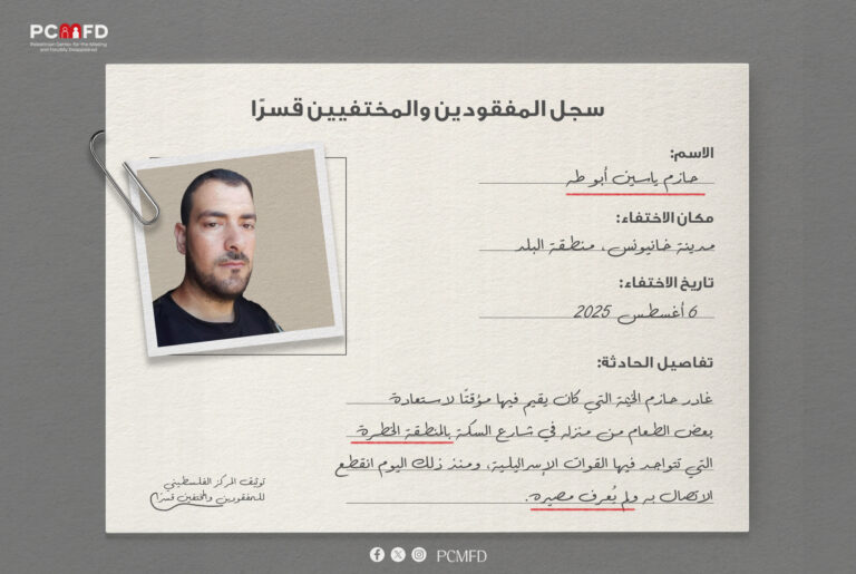 المركز الفلسطيني للمفقودين يوثق حالة اختفاء المواطن حازم أبو طه في مدينة خانيونس