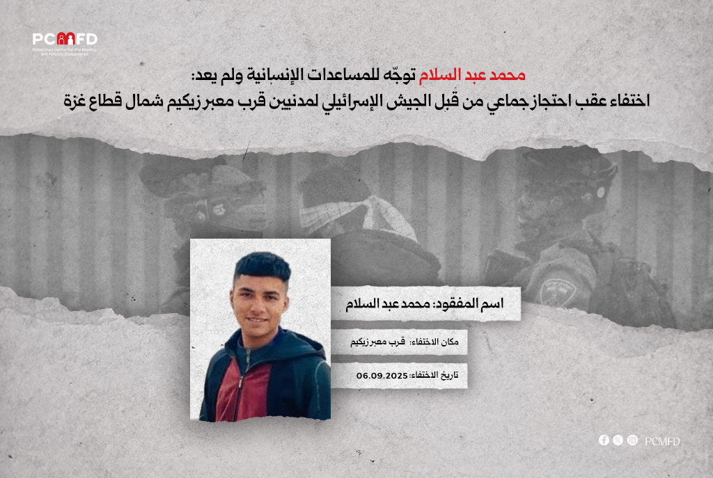 بعد مرور أشهر على اختفاء الشاب محمد عبد السلام، لا تزال عائلته تعيش حالة مستمرة من القلق والترقب، في ظل الغياب التام لأي معلومات رسمية أو إنسانية بشأن مصيره أو مكان احتجازه. وتعكس هذه الحالة نمطًا متكررًا من استهداف المدنيين الفلسطينيين في سياق العمليات العسكرية ونقاط المساعدات الإنسانية، وتؤكد الحاجة الملحّة لتدخل دولي عاجل يضمن حماية المدنيين، والكشف عن مصير المختفين، ومحاسبة المسؤولين عن جرائم الإخفاء القسري