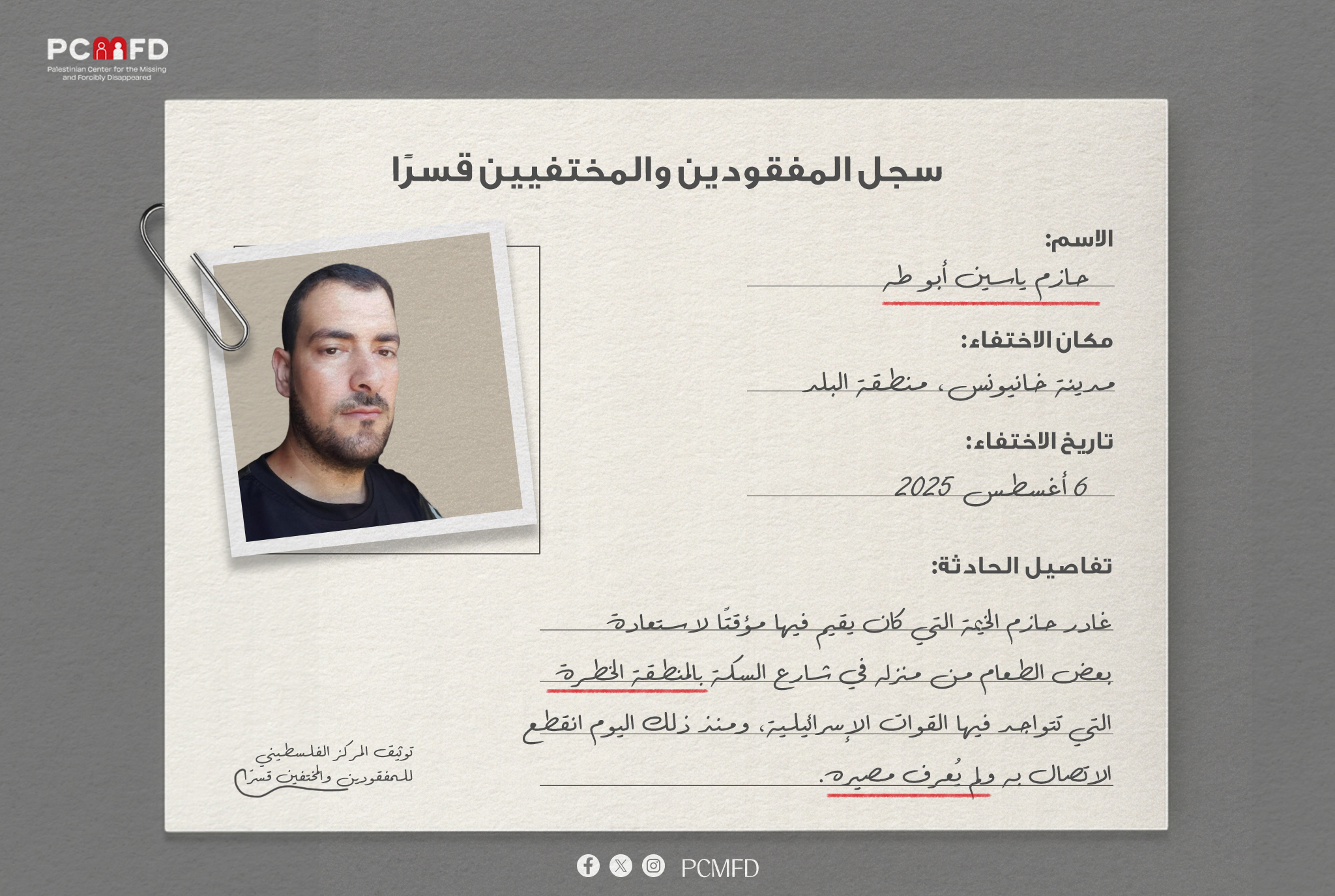 في إطار الجهود المستمرة التي يبذلها المركز الفلسطيني للمفقودين والمختفين قسرًا لتوثيق حالات الفقدان والاختفاء القسري في قطاع غزة، تبرز حالة المواطن حازم ياسين أبو طه كإحدى الحالات التي تنطوي على مؤشرات خطيرة على التعرض للاعتقال أو الإخفاء القسري، في ظل الأوضاع الأمنية المتدهورة واستمرار العمليات العسكرية الإسرائيلية في جنوب قطاع غزة، ولا سيما مدينة خانيونس.